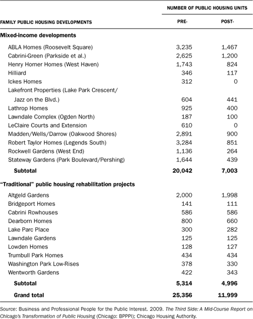 The plan was announced with great fanfare by the city and by HUD. Secretary of HUD Andrew Cuomo called it one of the highlights of his administration.22 The MacArthur Foundation pledged millions of dollars in support of the plan. Table 3.1 details the pre- and post-transformation landscape of family public housing in Chicago.