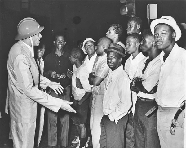 Figure 4. Raymond Pace Alexander (left) trying to calm demonstrators at the Columbia Avenue Riots, a three- day riot in “the Jungle” of North Philadelphia, home to nearly half of the city’s black population, Philadelphia Bulletin, August 28, 1964. The riot was sparked by escalating tensions between police and residents and widespread allegations of police brutality. Used with permission from Special Collections Research Center, Temple University Libraries, Philadelphia.