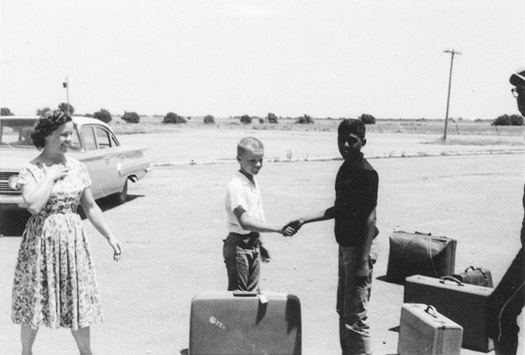 FIGURE 6. In 1960 Fresh Air host Mark Stucky of the Newton, Kansas, community shakes hands with Thomas Flowers from Gulfport, Mississippi, as Doris Zerger Stucky—Mark’s mother—watches. Used by permission of the Mennonite Library and Archives, Bethel College, North Newton, KS (Mennonite Library & Archives, Bethel, Kansas: Photo collection; folder: “Mississippi—Gulfport”).