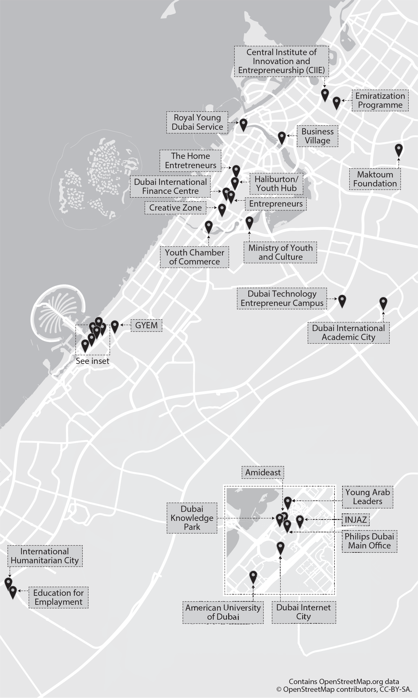 That the offices of EFE, Injaz, the Young Arab Leaders and the Al-Maktoum Knowledge Foundation are based in Dubai’s Knowledge Park, the adjacent Dubai Internet City, in Dubai’s International Humanitarian City and International Financial Center respectively is not a coincidence (International Humanitarian City 2021; Emirates News Agency 2017a). After all, these areas represent the globality of Dubai, as well as its role in the Arab region.