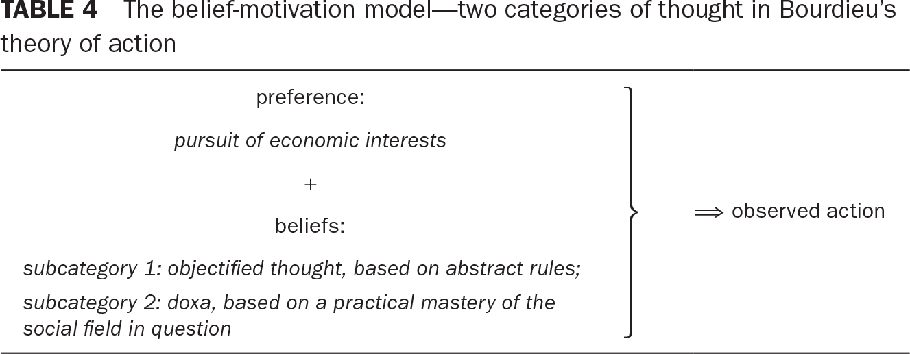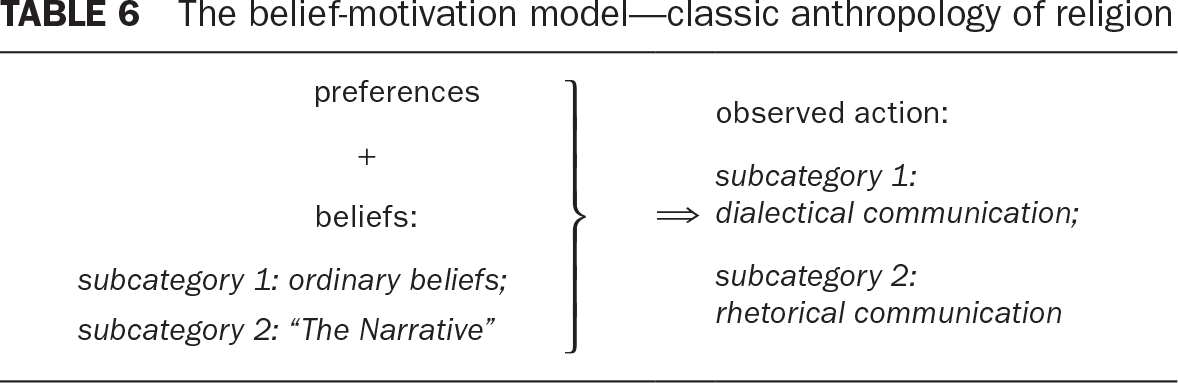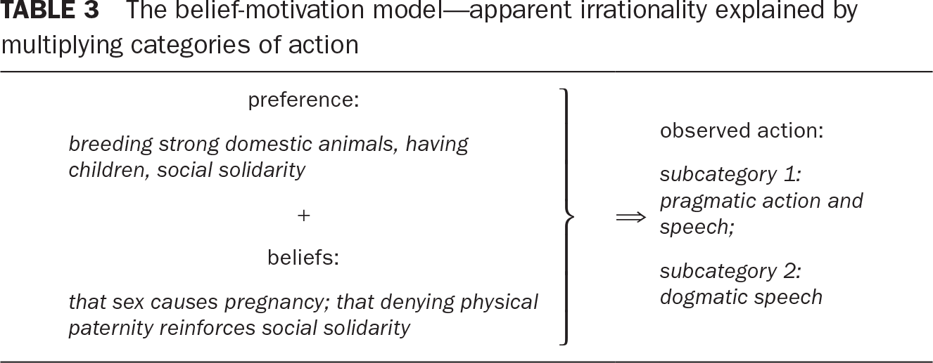 Leach’s concept of dogma shows that it is possible to complicate the belief-motivation model by introducing a distinction between two subcategories of action, without giving up on the idea of explicability (table 3). Once the expressive content of dogma is rendered in literal form (“I do not wish to challenge the prevailing social order”), it can be fed into the standard belief-motivation model like any other belief.