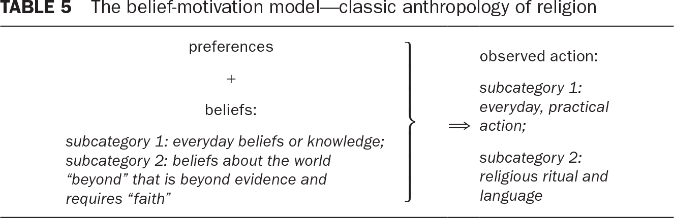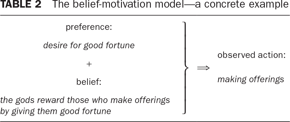 For example, if we have observed people making an offering to a god, we might use this theory to offer an explanation by supplying information about relevant beliefs and desires. This could be based on ethnographic or other data, if we have them, or we might have to speculate in a way that would at least be helpful in driving further research. The result might look something like table 2.