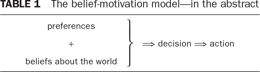 A simple and widespread theory of cognition is what philosophers have called the belief-motivation or belief-desire model of action (Elster 1986). This is the theory that action is the product of decisions that arise when preferences are considered in the light of beliefs about the world in which the actor is constrained to act (table 1).