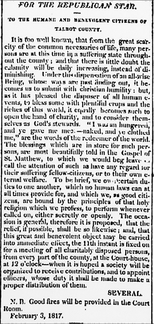 Figure 3. A Plea for Charity, 1817. This newspaper notice illustrates the depth of economic hardship in rural Talbot County after the War of 1812. Noting the growing number of citizens suffering “from the great scarcity of the common necessaries of life,” concerned citizens propose a meeting of all “charitably disposed persons” to discuss strategies for poverty relief. For the Republican Star. To the Humane and Benevolent Citizens of Talbot County. February 4, 1817, Republican Star, or Eastern Shore General Advertiser. Courtesy of University of Vermont.