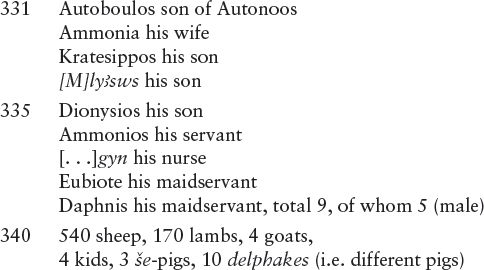 Continuing to exploit nomenclature as an ethnic denominator and exploring the detail of individual registers, we can learn still more of the early Hellenistic households in Middle Egypt. At the upper end of the scale, Greeks—those with Greek names—tended to live in far larger households than did Egyptians. These were military settler households with more family members, often with slaves and other dependents, and substantial holdings of livestock. Autoboulos, listed in a group of cavalry cleruchs, may serve as an example:25