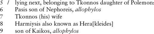 Here Tkonnos owns the house, though interestingly her husband Pasis comes first as household head. It is probably relevant that, contrary to normal practice in this period, Pasis is known only by his mother’s name without mention of his father. Such fatherless individuals might be disadvantaged, and Nephoreis’s son was perhaps fortunate to find a propertied wife.