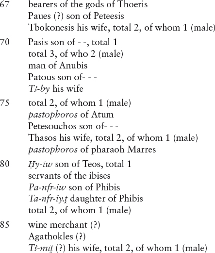 Two features are striking here. First is the small number recorded both in each family and occupation. In this section, only the bearers of the gods of Thoeris (the hippopotamus goddess Taweret, whom Greeks identified as Athene) have more than one family registered. Second, not surprisingly, is the predominance of Egyptian names among the minor cult officiants listed. It is only with the wine merchant Agathokles that a householder carries a Greek name, but, since wine rather than beer was the beverage of choice for the immigrants to Hellenistic Egypt, this too is not at all surprising. This coincidence, between type of occupation and Greek or Egyptian name, is one found throughout these registers. It is a feature to which we shall return.
