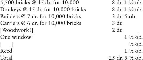 At the other end of the scale come the small mud-brick village houses, like that of Paapis, constructed at a total cost of just under twenty-six drachmas. Paapis too sent his account to Zenon:37