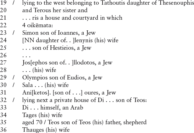 All forms of evidence bring their own problems, which need confronting and negotiating as we seek to reconstruct the village scene or understand the backdrop to urban life. A household registered for tax cannot always be equated with “a houseful.” Owners did not always live in the houses they owned, and fractional ownership is a well-documented phenomenon.38 In the documentary material there is little that allows us to distinguish between households and houses. Among the Ptolemaic salt tax registers, for instance, there is only one demotic register where the house (demotic pꜢc.wy) is listed as the main unit, and within this, households are separately enumerated with their different household heads. The following extract illustrates this phenomenon:39