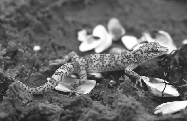 The Narrow Leaf-Toed Gecko (Phyllodactylus angustidigitus) feeding for beach hoppers and flies among sponges cast on the beach of Paracas Bay of southern Peru. Photo by Alessandro Catenazzi.