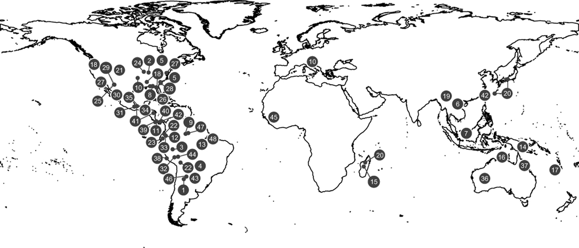 Map showing the geographic locations of field sites discussed in the essays. The numbers correspond with the essay numbers. This map was created by Alison Davis Rabosky.