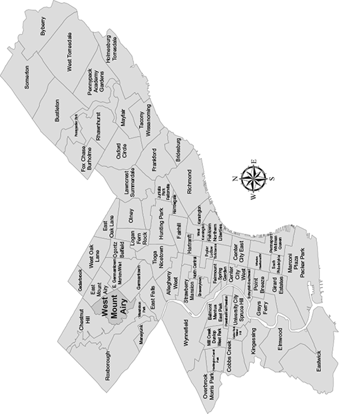 Map 1. Map of Philadelphia neighborhoods. Prepared by David Ford, assistant director, Temple University Social Science Data Library.