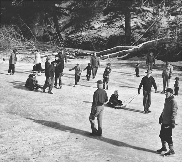 Figure 1. Families sled and ice skate on Wissahickon Creek in Fairmount Park’s Wissahickon Gorge, Philadelphia Bulletin, 1955. Used with permission from Special Collections Research Center, Temple University Libraries, Philadelphia.