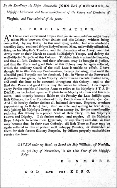 “By his Excellency the Right Honourable John Earl of Dunmore, his Majesty’s Lieutenant and Governour-General of the Colony and Dominion of Virginia, and Vice-admiral of the same. A proclamation,” 7 November 1775. Courtesy of American Memory, the Library of Congress.