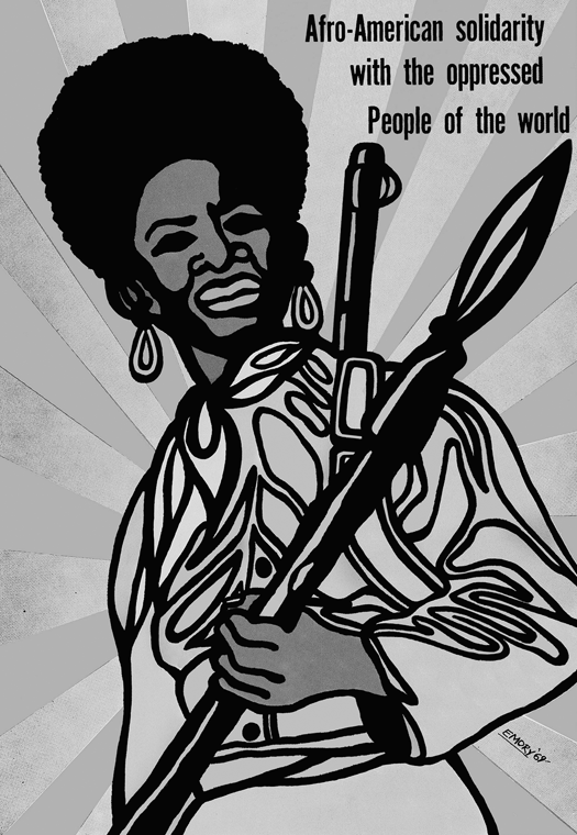 The party’s discourse also often clashed with its avowed commitment to gender equality. Women, including Tarika Lewis, Kathleen Neal Cleaver, and Judy Juanita, were involved in the party from early on and made important contributions to the development of the Black Panther. But while images of female warriors were not uncommon, the party’s anticolonial vernacular simultaneously reinforced notions of patriarchy while frequently relegating women to supporting roles in the revolution. The armed women who appeared in party-sanctioned art could easily slide into what scholar Anne McClintock referred to as Fanon’s “eroticized image of militarized sexuality” that “masculinizes the female militant, turning her into a phallic substitute, detached from the male body but remaining, still, the man’s ‘woman-arsenal.’ ”91 As Robeson Taj Frazier noted in his study of radical black internationalism during this period, even in the most revolutionary “representations and articulations, female agency and femininity conformed to male standards; subversive women were dominantly framed in hegemonic masculine and heteronormative terms.”92
