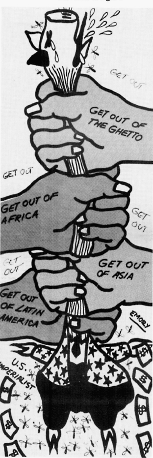 During this period, Mao joined a host of other Third World figures as additional referents that came to define the party’s public image within the black community and beyond. In a May 1968 essay, Minister of Education George Murray invoked Fanon in asserting that “[w]e can create a black world, a black nation… . The way we can make this happen is through violence… . When we take out a policeman, major businessman or senator … we are educating ourselves and people like us.” The rhetoric of anticolonial violence simultaneously linked the Panthers to both the black past (via the history of slave rebellions) and the revolutionary Third World of the present. Such actions, Murray declared, would be “in the spirit of Malcolm X, Huey P. Newton, Nat Turner, Denmark Vesey, the Viet Cong, and black guerillas in Southern Rhodesia.”77 When Emory Douglas drew armed Panthers flanked by Cuban guerrillas and Native American warriors or a figure of a pig labeled “U.S. Imperialism”—with its neck being wrung by black and brown hands labeled “Get out of the ghetto, Get out of Africa, Get out of Asia, Get out of Latin America”—it conveyed in simple and direct terms that the local struggle waged by the BPP in Oakland was linked to a long history of global struggle against white supremacy and colonialism.78