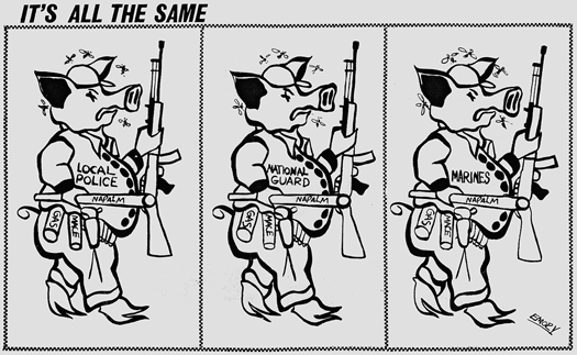 Illustrations by Emory Douglas and Tarika Lewis, published regularly in the Black Panther and often turned into posters and other forms of public art, used a visual vocabulary to similarly demonstrate links between the Panthers’ local struggles and other movements around the world resisting white supremacy, capitalism, and U.S. militarism. In an illustration headed “It’s All the Same,” published in March 1968, Douglas used three panels to depict identically clothed pigs armed with guns, napalm, and mace, labeled “local police,” “national guard,” and “marines.”53