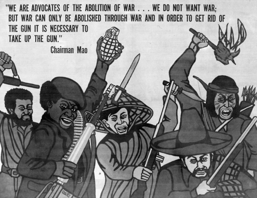 The verbal and visual emphasis on anticolonial violence in the pages of the Black Panther and elsewhere also served to served create transhistorical and transnational links between the BPP and individuals, groups, and nations that fought for self-determination against colonialism and white supremacy. In arguably the most famous photo of Newton—first appearing in the Black Panther in June 1967 and repeatedly reprinted in the newspaper as well as on posters—the BPP’s minister of defense was pictured sitting in a large wicker throne, with a modern M1 rifle in one hand and a spear in the other, personally embodying a kind of “imagined community” (to use Benedict Anderson’s phrase) that linked black Americans to their African ancestors as well as contemporary resistance to white supremacy and colonialism.75 The increasingly prominent role of Mao Zedong in the Panthers’ visual and verbal lexicon was also symptomatic of a larger shift in the way the party expressed its connections to the Third World. Whereas previously the BPP had used the Red Book primarily as a tool to raise money within white radical circles, Mao’s assertions that that “political power grows out of the barrel of a gun” and that “in order to get rid of the gun it is necessary to take up the gun” featured heavily in the pages of the Black Panther and in the speeches of Panther leaders in 1967–68. By 1969, Bobby Seale could stand in front of a large, multi-ethnic rally outside the San Francisco Federal Building and exhort the crowd to “[h]old your Red Books up and tell the brothers where we getting some new ideology from.”76