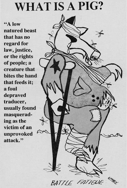Huey said, just before we went to press with the second issue of the newspaper, “We have to have some terms that adequately define the police and fascist bigots who commit murder, brutalize, and violate people’s constitutional rights.” I told him we already called those who actually do this “fascists” and “swine.” Huey said, “Yeah, but black people aren’t picking it up. It’s not simply enough so that they’ll understand it. Children, teenagers, and older people, everybody.” Then Huey, walking around the room thinking, said, “Swine … pig … swine” and Eldridge sat down at the typewriter and typed out the definition.47