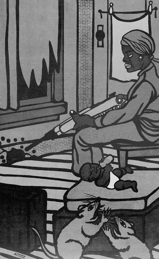 Illustrations in the pages of the Black Panther provided one of the most powerful tools in the BPP’s efforts to convey the impact of colonial violence on daily life in the black ghetto and its links to U.S. imperialism overseas. Emory Douglas’s depictions of snarling, armed pigs terrorizing the black community easily paired with similar illustrations depicting violence inflicted against the Vietnamese and other Third World peoples struggling for self-determination. Tarika Lewis contributed similarly themed drawings of police violence and intimidation featuring hideous pigs dressed in police uniforms and terrorizing black youth.65 By the end of the 1960s, Douglas had begun experimenting with ways to illustrate the more subtle ways in which white colonial control of the ghetto inflicted violence and suffering on black people. One of his iconic images depicted an armed black woman sitting in wait for a greedy landlord, while beside her a baby is eyed by oversized rats.