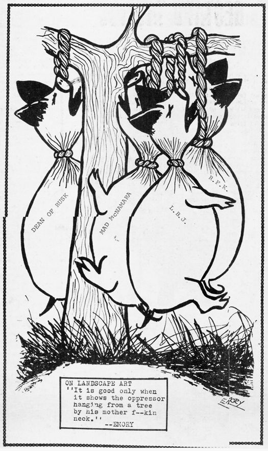 An illustration from March 1968 depicting Lyndon Johnson, Robert F. Kennedy, Secretary of Defense Robert McNamara, and Secretary of State Dean Rusk as pigs with broken necks, for example, was paired with words “on landscape art”: “It is good only when it shows the oppressor hanging from a tree by his mother f—kin neck.”57