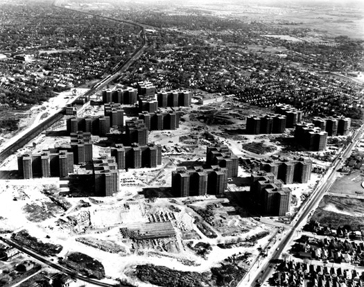 Figure 7. Aerial view of Rochdale Village, ca. 1964. United Housing Foundation Papers, Kheel Center, Cornell University.