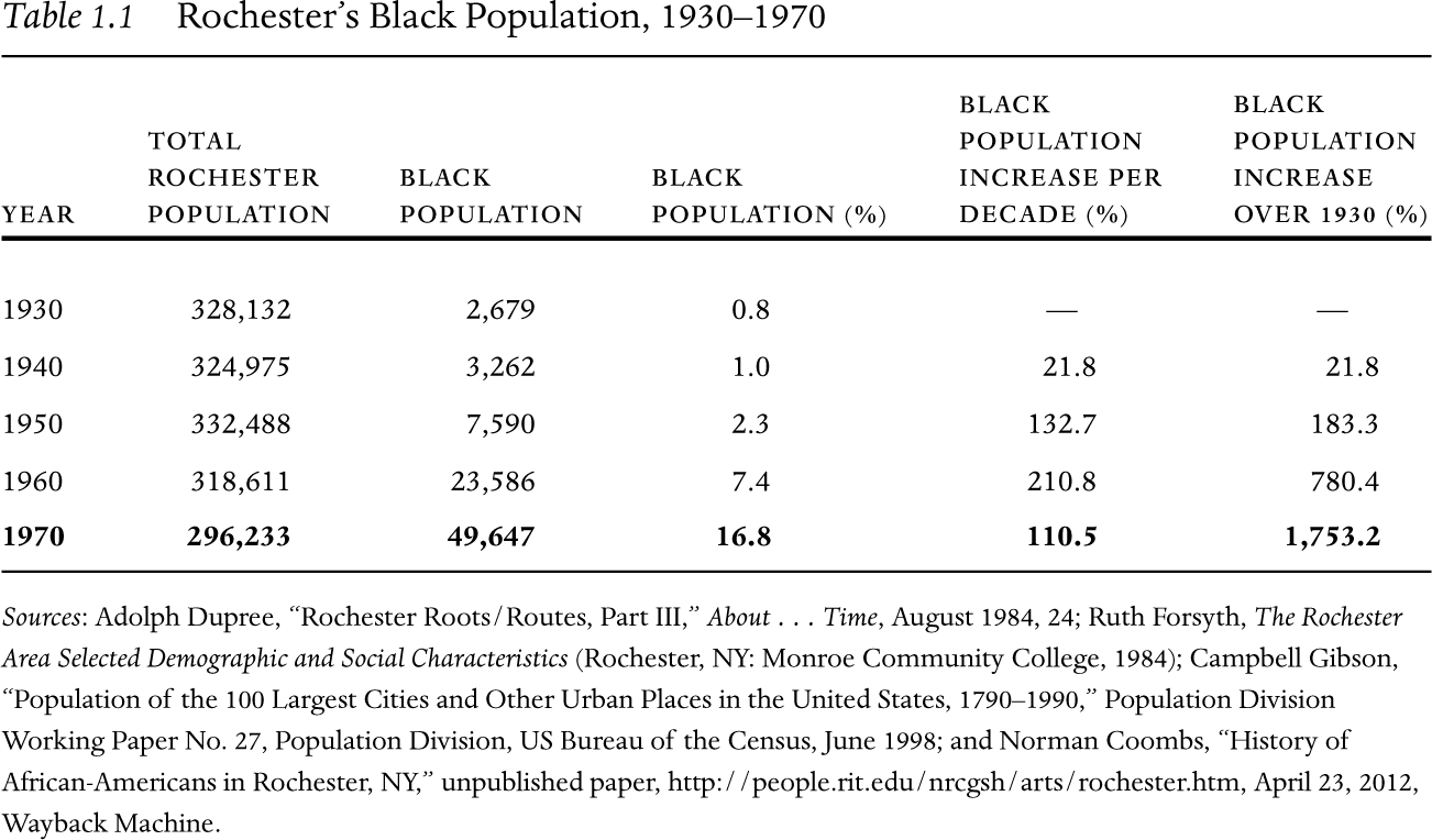 Rochester did provide opportunities for agricultural migrants. A less studied and less understood facet of the Great Migration is the trickle-down effect industrial expansion had on rural and agricultural areas in the North. Take for example the more than 40,000 African Americans who moved to Rochester between 1950 and 1970, which more than tripled the Black population (see table 1). As the story of Robert Williams demonstrates, their presence was not the result of an open industrial labor market grateful for their presence. Rochester’s corporate world relied on a highly skilled and technically trained workforce. Kodak and Xerox required laborers to have at least a high school diploma whether the job in question required this level of education or not.7 They also preferred to fill industrial openings with local, white agricultural laborers eager to abandon the grueling work and long hours in the fields in exchange for stable, year-round work that promised better wages and benefits.8 The absence of white laborers, of course, created substantial openings for field hands to maintain and harvest crops throughout the summer and fall. At the same time, increasing mechanization in the southern agricultural landscape had left many Black agricultural workers jobless.9