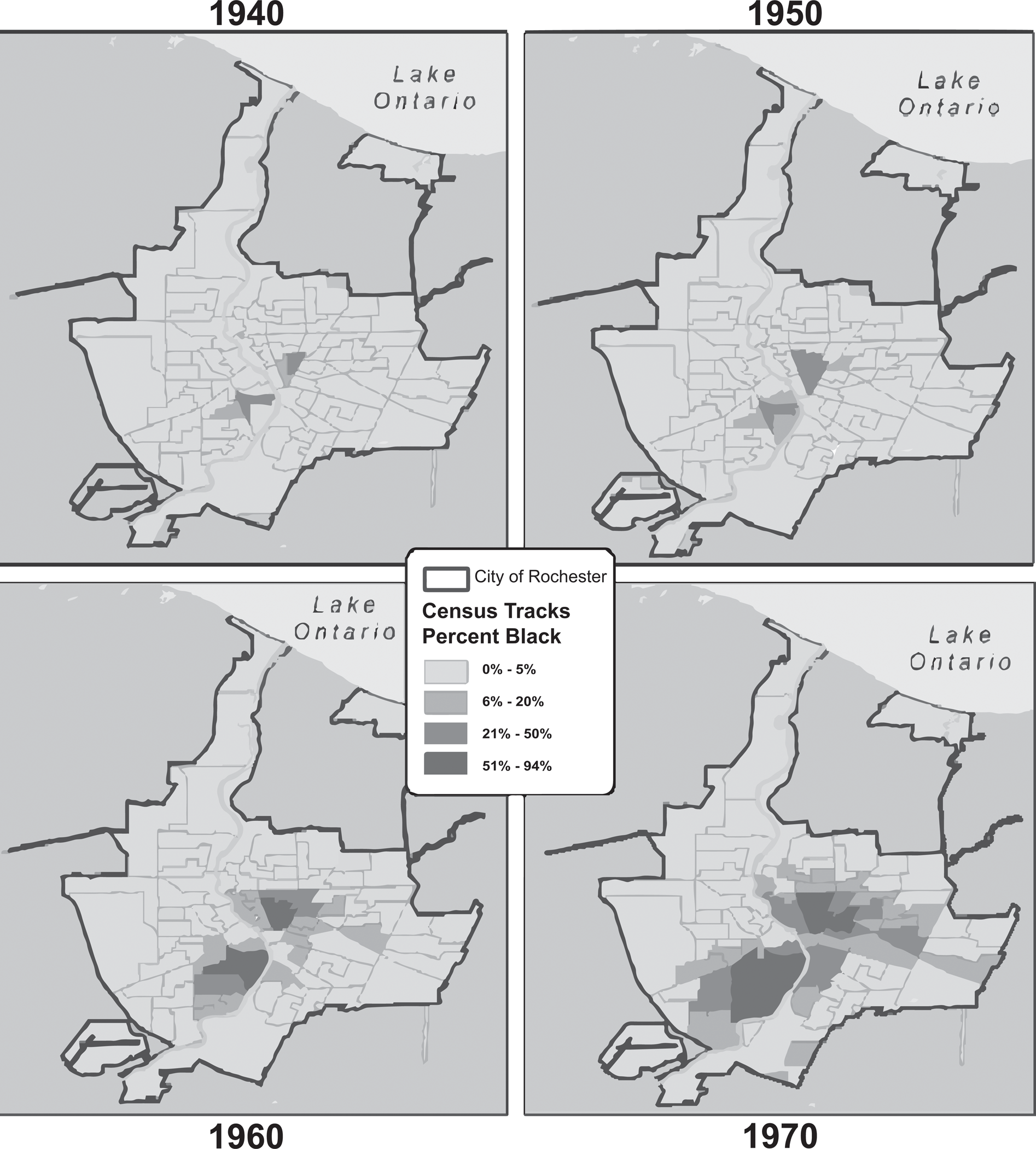 FIGURE 1.1.   Black Population Percentage by Census Tract for the City of Rochester, NY, 1940–1970. Created by Binghamton University’s GIS Core Facility.