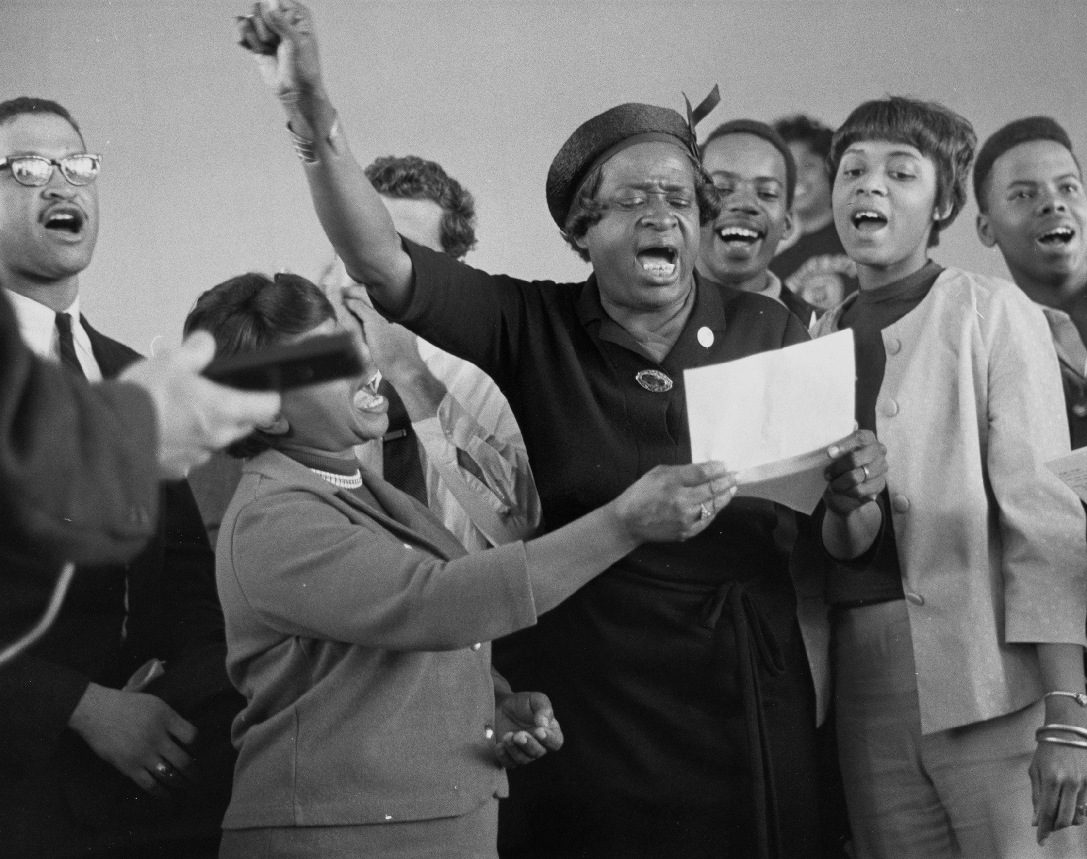 FIGURE 2.1.   Mildred Johnson leads Flemington protestors in song before picketing. Photograph, Flemington, NJ, ca. 1967. Box 119, folder 5, Kodak Historical Collection #003, D.319, Rare Books, Special Collections, and Preservation, River Campus Libraries, University of Rochester. Credit: Used with permission from Eastman Kodak Company.