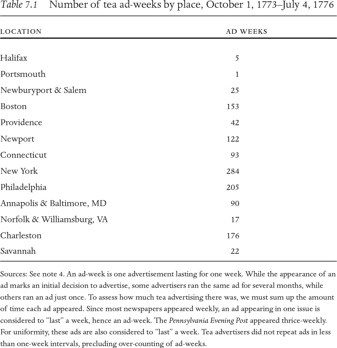Tea advertising did not appear with the same frequency across newspapers or cities. Table 7.1 shows tea advertising by geography. Although tea ads appeared for similar periods in Philadelphia and New York, significantly more ads appeared in the latter, despite New York being a smaller city with half as many newspapers. The greater number of advertisements in New York may have been a function of the city’s tea sellers’ preference for advertising as a medium. Virginia merchants largely did not advertise tea. This was not because they eschewed tea but because trade, whether via the factor system or direct order from London, did not necessitate advertising. Norfolk was Virginia’s biggest port, but the Norfolk Intelligencer ran only one ad mentioning tea on and off for four weeks.5 In Baltimore and Annapolis, by contrast, tea advertising was more common.