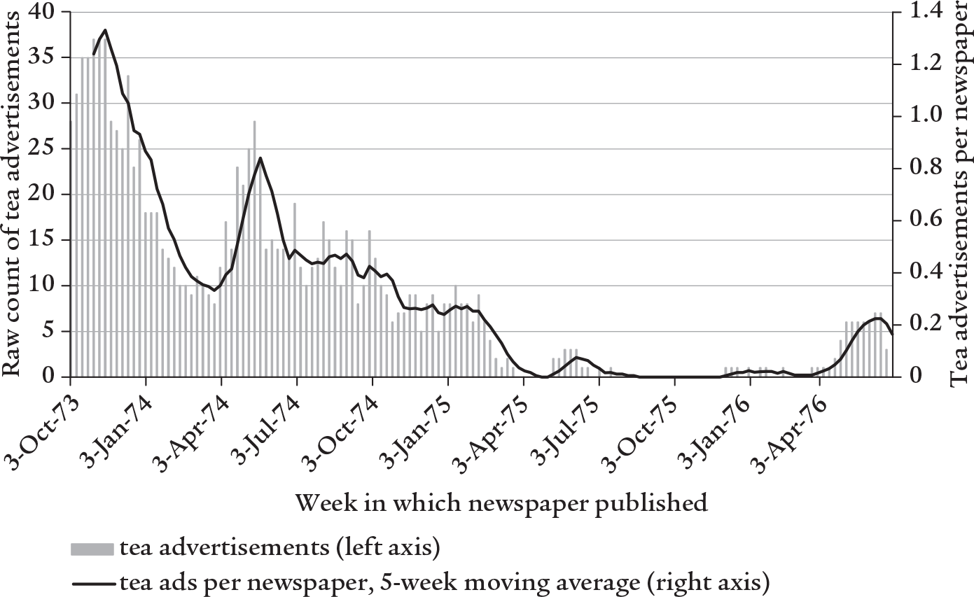 Figure 7.1 depicts the changing frequency of tea ads. Gray bars show the number of tea advertisements found in a given week. The black line represents the number of weekly advertisements per newspaper examined (the rate of tea advertising). Varying survival and availability of newspapers makes the black line the better tool. If the same tea ad appeared in multiple weeks, it is counted each week it appeared, as this figure measures advertisements per newspaper examined.2