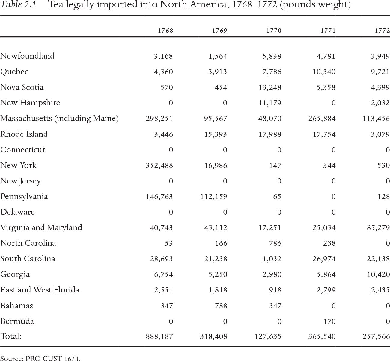 In the colonies, Patriots objected to the Revenue Act in the winter of 1767–1768, even though, for tea at least, it represented a tax cut. The colonial smuggler liked the old taxes that had kept out the legal competition. In the summer of 1768, Patriots wrote against the Revenue Act. But in the first eighteen months of the law (July 1767 to December 1768), legal tea imports increased 42 percent in Philadelphia and 100 percent in New York as merchants stocked up. Patriots also resisted customs officers by force, as had occurred in Britain for years. Custom houseboats were burnt, seized goods “rescued,” officers tarred and feathered. In 1768, John Hancock openly landed wines without going through customs, then registered his vessel “in ballast.” Not one of the various witnesses who saw it was willing to testify against him. This omertà enabled smuggling. Boston Patriots launched a non-importation movement, pledging not to import objectionable goods from Britain, including tea. New York and Philadelphia merchants joined in early 1769. But merchants in regional ports, like Halifax, Portsmouth, Providence, and Newport did not. Those towns saw spikes in legal tea imports, which then supplied New England demand despite Boston’s non-importation (see table 2.1). Maryland merchants kept their movement weak, and tea imports increased in the Chesapeake in 1769 despite the Virginia Resolves. Tea imports continued in South Carolina, too. While some merchants signed non-importation pledges, non-signers still imported, including Thomas and Elisha Hutchinson (sons of the governor) and Richard Clarke & Sons in Boston, all of whom would be among the East India Company’s tea consignees in 1773. In 1769 the Hutchinsons brought in roughly 50,000 pounds of tea, half of Massachusetts’s legal supply. Benjamin Woods Labaree, in his canonical The Boston Tea Party, thought these men “obstinate,” but they had buyers, and tea imports continued across the colonies. Were they not just practical? The Hutchinsons’ tea was carried on a ship owned by John Hancock, a Patriot with a pragmatist’s nose for money.20