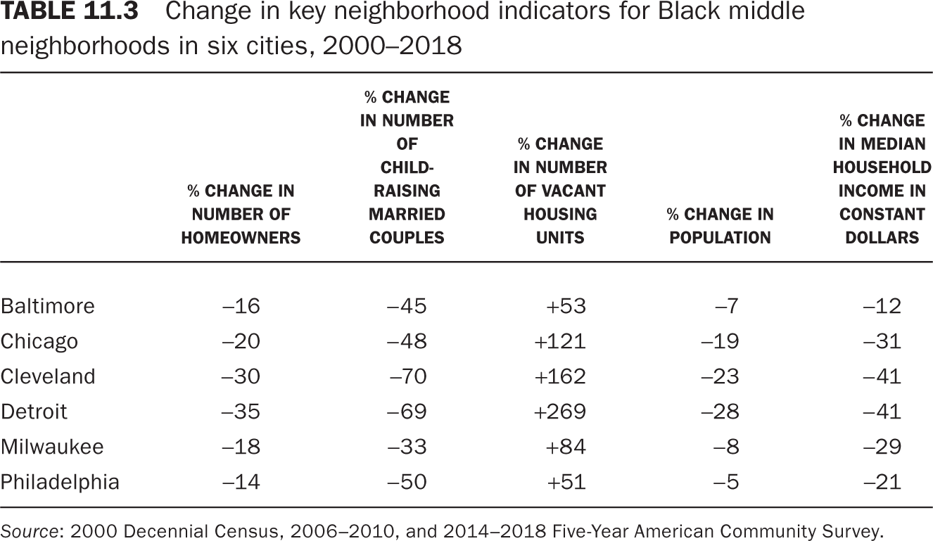 Trends are similar in Black middle neighborhoods in Chicago, Cleveland, St. Louis, and many other cities. Neighborhoods that had been relatively stable for decades and were still vital communities in 2000 had lost ground with respect to social, economic, and housing market indicators by 2018. Table 11.3 shows the aggregate change in key indicators for predominantly Black (80 percent or more Black) middle neighborhoods in six older American cities. While the conditions vary from city to city, with Baltimore’s Black middle neighborhoods faring considerably better than those of Detroit and Cleveland, all lost ground. This does not mean that every neighborhood lost ground; indeed, in each city a few remained stable, and a handful may have even revived or gentrified. But the great majority followed a downward trajectory, gentle in Baltimore and steepest in Detroit and Cleveland.