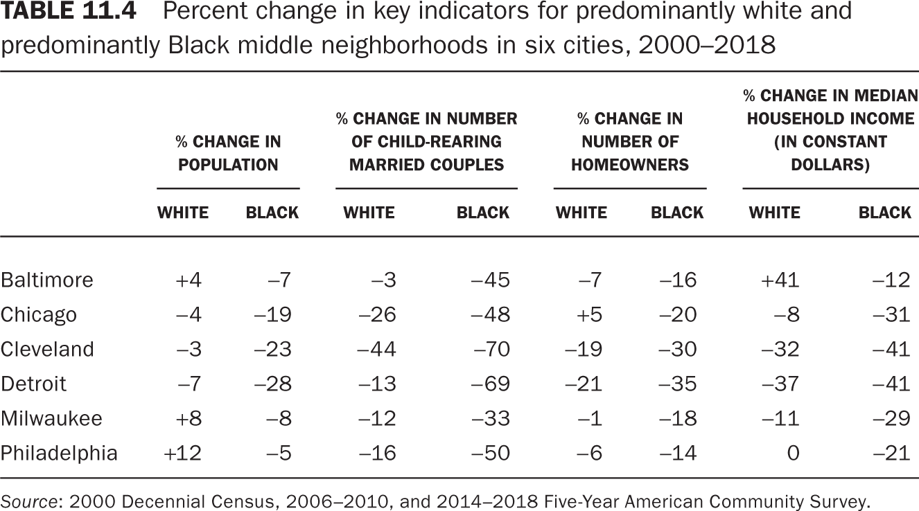 Table 11.4 shows aggregate change for predominantly white and predominantly Black middle census tracts from 2000 to 2018. Relatively few white middle neighborhoods, outside of Baltimore, actually gained ground, yet in every city, with respect to every indicator, white neighborhoods fared better, or at least less poorly, than Black neighborhoods in the same city.