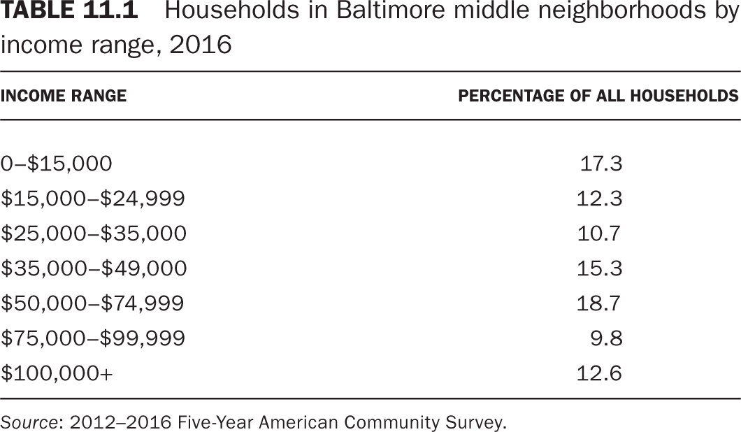 Middle neighborhoods tend to contain a more diverse economic mix than wealthy and poor neighborhoods, both of which are increasingly economically and demographically homogenous. As table 11.1 shows, in the seventy-one tracts with tract median incomes in 2016 between $35,000 and $55,000 in Baltimore, at most 20 percent of the households living in those tracts actually have incomes in that range; the incomes of the people who live in these tracts are evenly distributed across the entire range from under $15,000 to over $100,000. These tracts, taken as a group, have retained the mixed-income character of the traditional urban neighborhood, itself an important value. The social benefits of mixed-income communities, although hard to quantify, are real and significant.