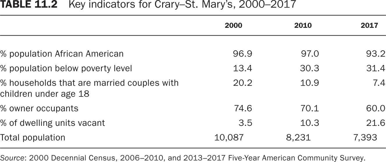 By 2010 conditions had changed dramatically, a change that has continued particularly with respect to the increase in vacancies and the decline in homeownership (table 11.2). By 2017, the area’s median household income had dropped to $31,805, a 44 percent decline in real income adjusted for inflation. In only a few years, Crary–St. Mary’s had changed from being a stable middle-class neighborhood to becoming a more thinly populated area struggling with high vacancies and concentrated poverty (figure 11.2).