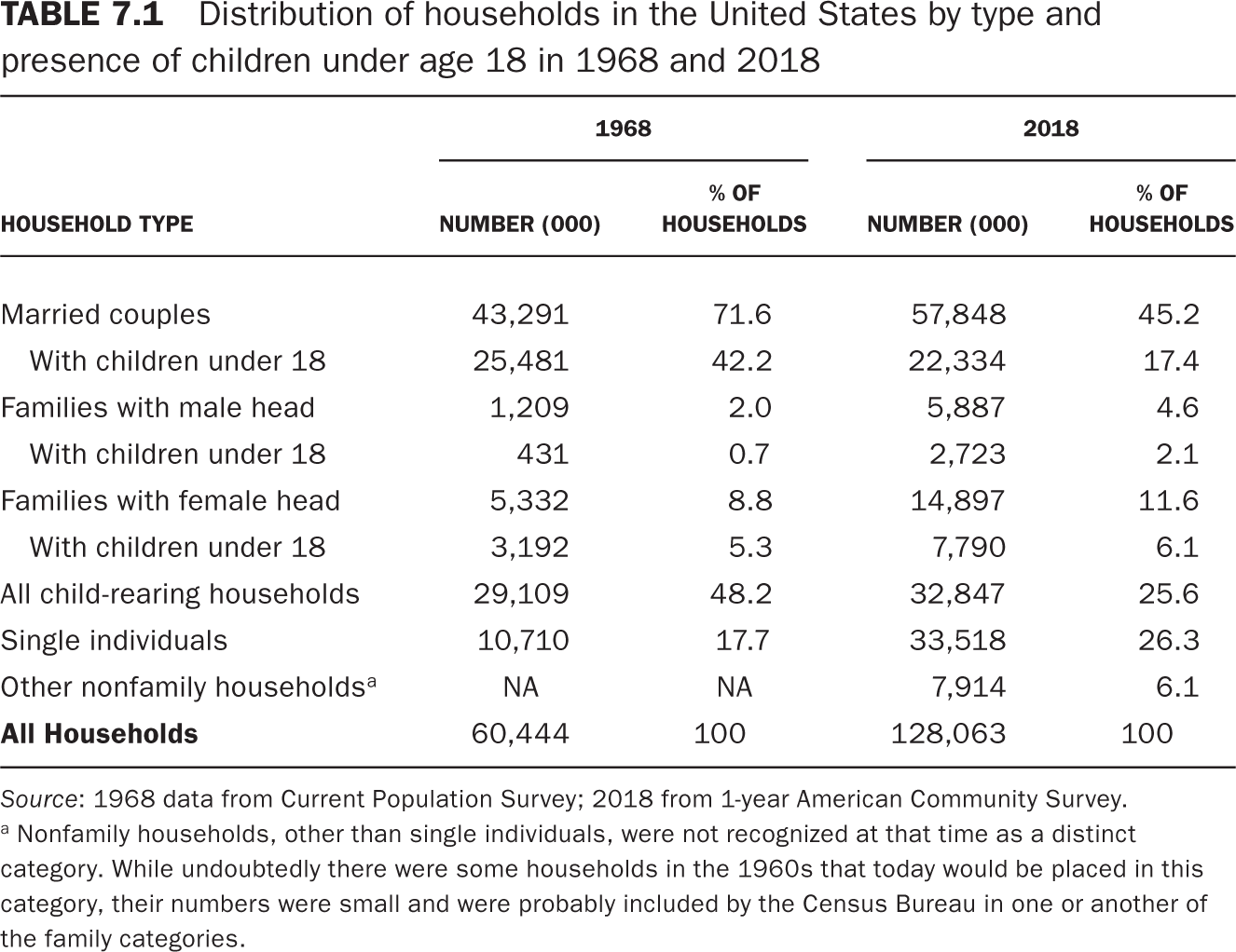 The United States of the 1960s was a nation of families and above all married couples. As table 7.1 shows, in 1968 nearly three-quarters of American households were married couples. Most were raising children, and of those who were not, most would be raising children in the future or had finally seen their youngest child leave the home. Men and women married far younger and had shorter life expectancies than today. In 1956 the median age for first marriage in the United States was 22.5 for men and 20.1 for women, while life expectancy was 67 years for men and 73 years for women. For most Americans, life included only brief passages through two phases that people today see as extended stages of adult life: independent adult life before marriage and life as active empty nesters before transitioning into old age. Both phases have become important drivers of neighborhood change.