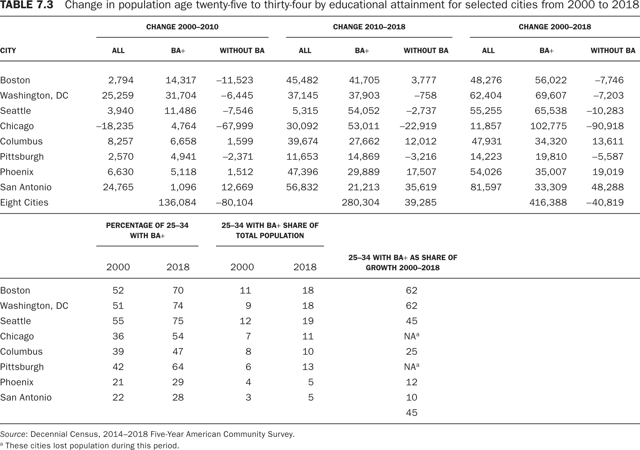 Table 7.3 shows the change from 2000 to 2018 in the number of young people aged twenty-five to thirty-four by education level for eight American cities: three magnet cities, three reviving midwestern cities, and two Sunbelt cities. In looking at table 7.3, one should bear in mind that in 2018, 36 percent, or slightly more than one-third of people aged twenty-five to thirty-four overall in the United States, had a BA or higher degree and made up only 5 percent of the population of the United States as a whole. From 2000 to 2018, the number of young people with a BA+ degree grew by 416,000 in these eight cities, accounting for almost half of their total growth; in Boston and Washington, D.C., they were over 60 percent of all growth, while in Chicago their number grew by over 100,000 while the city lost 177,000 people overall. In every city, the increase in young grads was greater from 2010 to 2018 than during the previous decade.