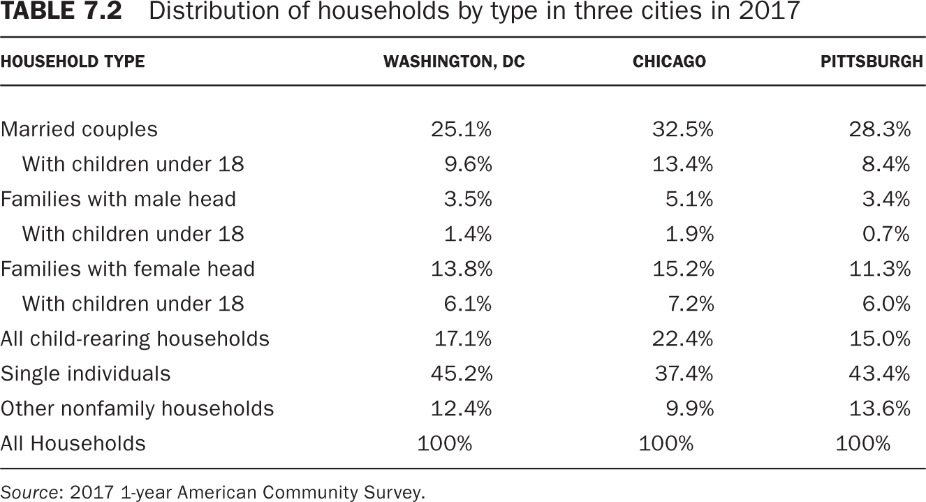 These shifts have been most pronounced in the nation’s central cities (table 7.2). More families have left, and more single people have moved into cities compared to less urban places. Nearly half of all the households in Washington, D.C., are single individuals. Only one out of four are married couple households, and fewer than one in ten are married couples raising children. Both Washington and Pittsburgh have far more nonfamily households, including unmarried couples living together and people in a variety of informal sharing arrangements. This may not quite be the “childless city” bemoaned by some commentators, but their characterization is not too far from the mark.2