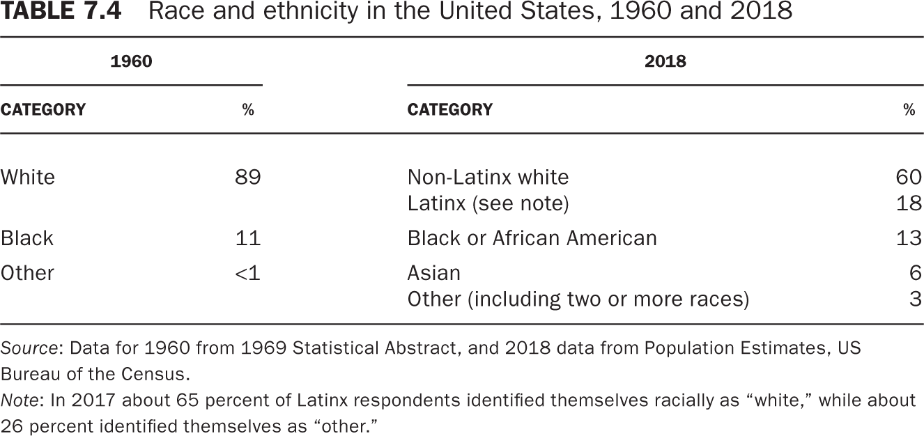 Table 7.4 compares the racial and ethnic composition of the United States today to that of 1960 but that table barely begins to hint at the diversity of the American population. Roughly 10 percent of American Black people are African and Caribbean immigrants, while the Asian umbrella includes not only large numbers of people from China, Korea, India, and the Philippines but also some from virtually every Asian nation. The Census Bureau breaks down America’s fifty-six million Latinx residents into twenty-four separate subcategories and even then finds that over one million fail to fit into any category. Nearly 14 percent of the nation’s population are foreign-born, only slightly fewer than at the historic peak nearly a hundred years ago.