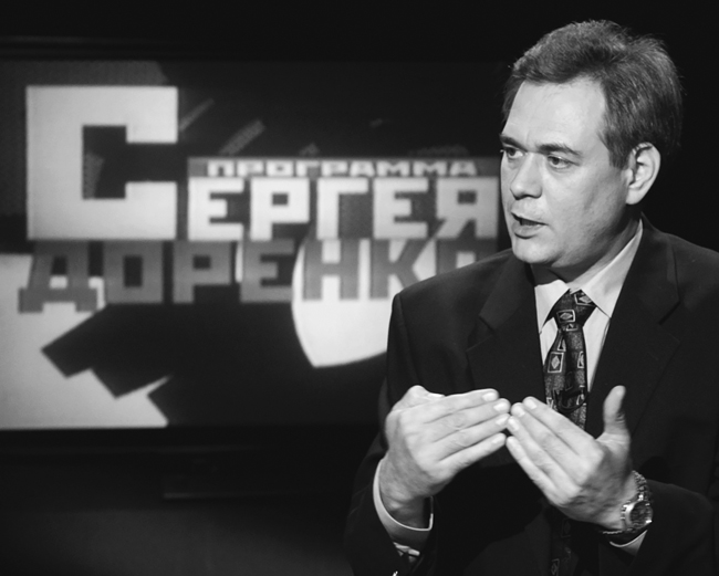 Figure 16. Sergei Dorenko on his nightly news program. TASS archive/Diomedia.