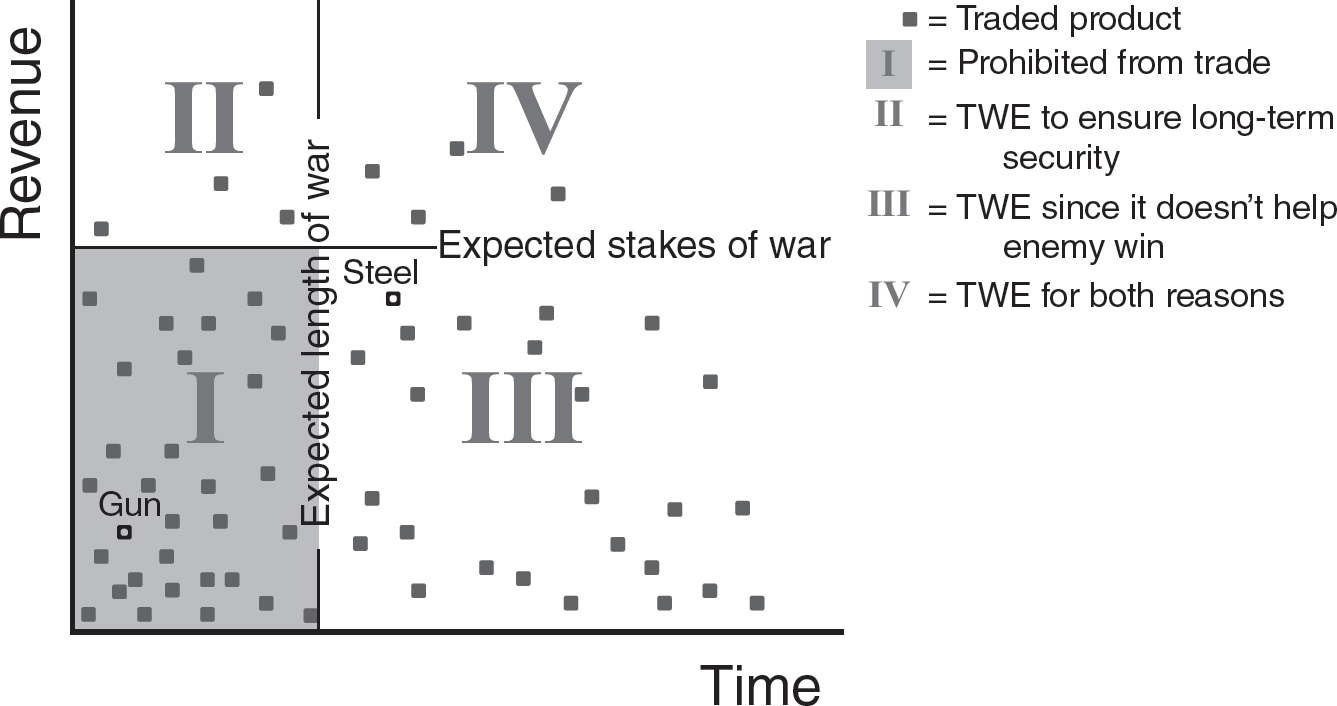 To determine whether a specific product should be traded with the enemy, a state assesses the product’s characteristics relative to the expected nature of the war. Product characteristics provide a ranking of products from least dangerous to most dangerous and least important to the economy to most important. War expectations provide thresholds for what is too dangerous and too important. If it takes the adversary longer to convert a product into military capabilities than the war is expected to last, trade in that product can continue as it will not help the enemy win. If the product’s contribution to the economy is greater than what the state is willing to lose to ensure its survival, trade in that product can continue as the state needs the trade to maintain its long-term security. If the enemy can convert the product into military capabilities before the end of the war and if losing the trade does not affect the state’s long-term security, trade in the product is likely to be severed during the war.