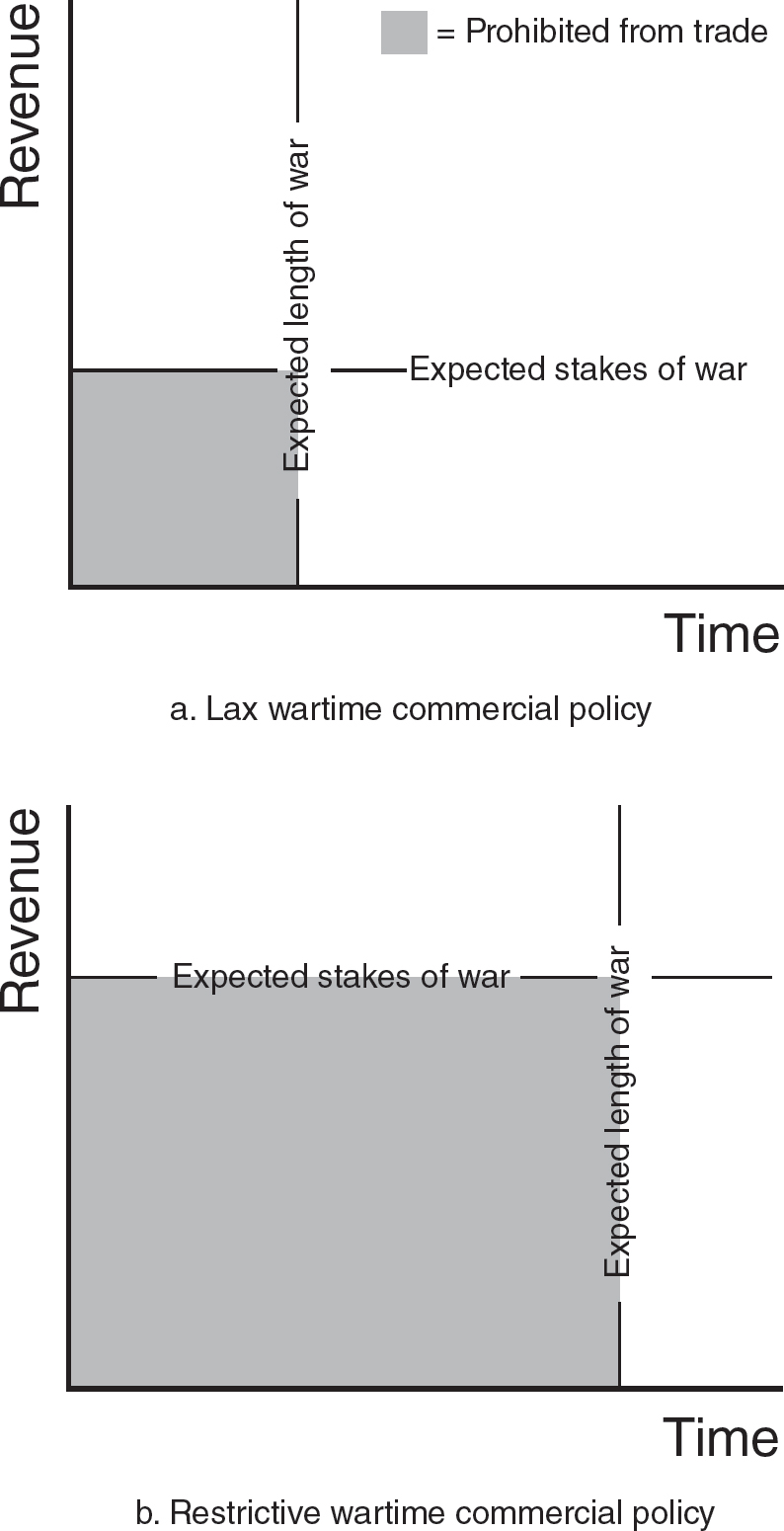 While product characteristics can be used to rank products on the basis of which are more or less likely to be traded with an enemy, they are not sufficient to explain a state’s wartime commercial policy. Just as states tailor their military strategy to the war they expect to fight, they tailor their wartime commercial policies to the expected war. Two dimensions are relevant to the decision to trade with the enemy during war: the expected length and expected stakes of the war.19 Together these determine how much the state will suppress wartime trade. The expected length of war determines the amount of time the enemy has to convert gains from trade into military capabilities to affect the outcome of the current conflict. The value states attach to the expected stakes of the war corresponds to the revenue loss they are willing to tolerate to ensure their survival. A state expecting a short war of little concern to national security is likely to set a lax wartime commercial policy. A state expecting a long, existential struggle is likely to set a restrictive policy.