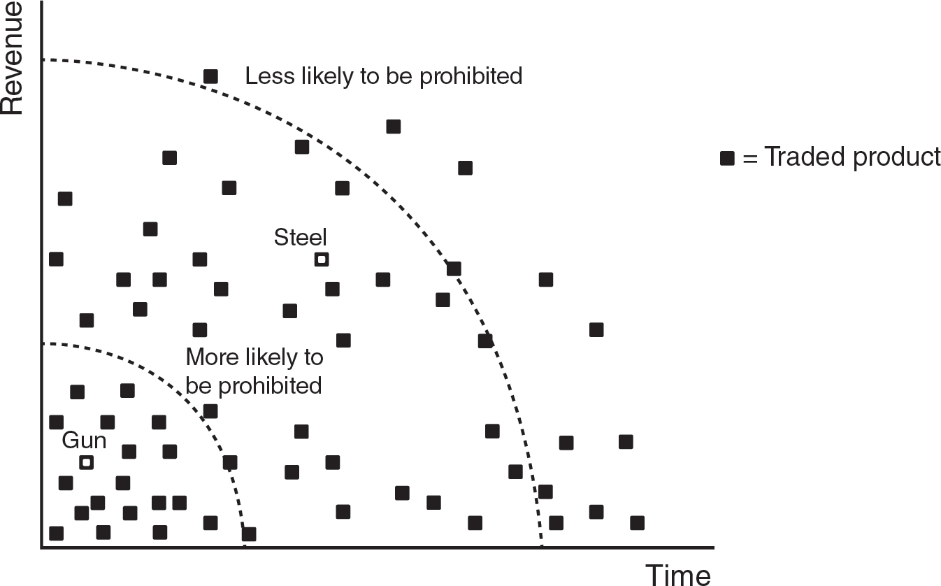 The likely arrangement of products suggested here, on the scale measuring the loss of state revenue due to severed trade, is based on an efficient economy. However, even if the economy is not operating efficiently, the state can create a similar scale, though products would be located differently on it. For example, if prohibiting trade in a product increases domestic production to a level that increases a state’s GDP—that is, the war permits the state to escape the unfavorable economic policies that have been imposed on it—severing trade will have a positive impact on state security, and trade in this product will be on the lowest end of the scale. If the state does not tax trade, then only the product’s circulation in the domestic economy affects the state’s revenue. Alternatively, if the state does not tax domestic production, then only the import or export taxes are relevant for determining where a product will rank. Regardless of how specifically its economy functions, the state can still sort products on the basis of the revenue lost from severing trade and therefore their impact on security.
