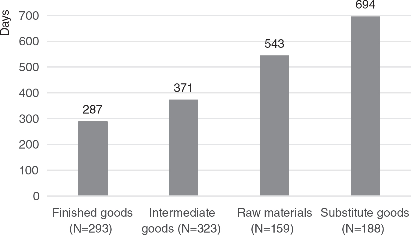 Figure 4.3 generalizes this pattern across all the products that were prohibited from trade with the enemy. On average, it took about nine months for finished goods to be prohibited from export, a year for intermediate goods, a year and a half for raw materials, and about two years for substitute goods.143 This pattern suggests that conversion times dictated the timing of prohibitions as products at the beginning of the supply chain were prohibited earlier than products at the end of it.