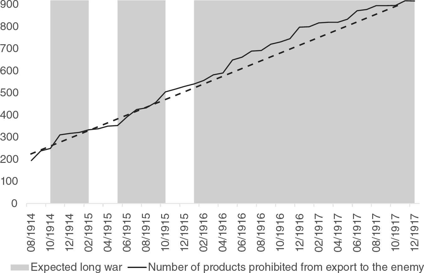 Figure 4.1 aggregates the number of products Britain prohibited from export to countries adjacent to the enemy for each month of the war through the end of 1917. While Britain continued to change its wartime commercial policy in 1918, the prohibitions made in that year prevented products from leaving the country and were not necessarily associated with trade with the enemy. The number of products prohibited specifically from trade with the enemy remained stable after 1917.