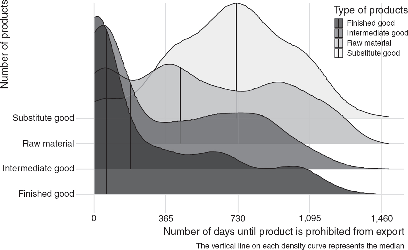 Fig. 4.2. Density plot of the distribution of days before a product in each category was prohibited from trade with the enemy